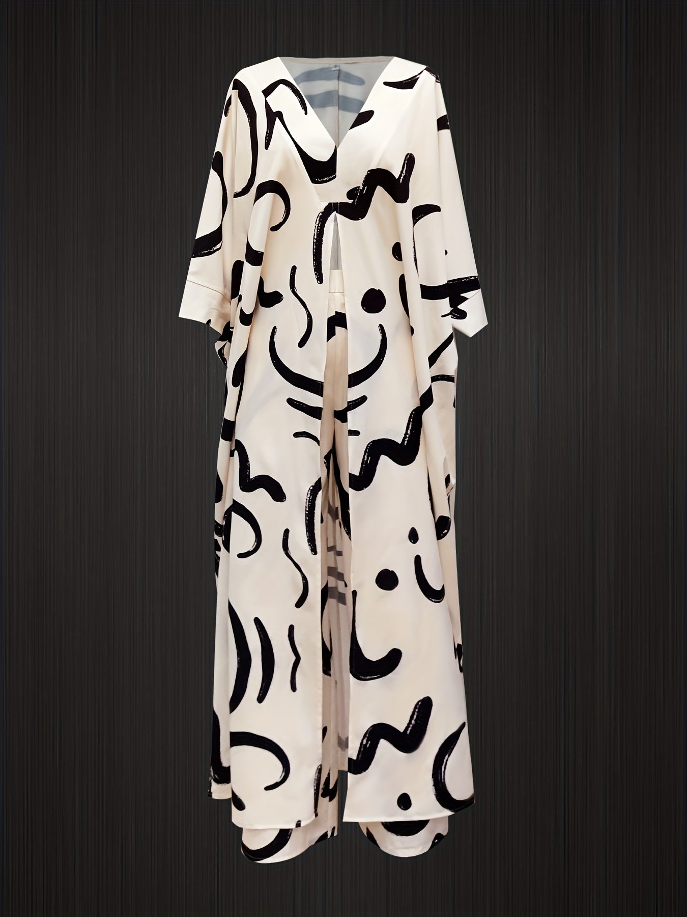 Design Elegante: A blusa longa com gola V e a calça estampada de corte reto trazem equilíbrio perfeito entre sofisticação e estilo moderno. O tecido estampado abstrato garante destaque em qualquer ambiente.